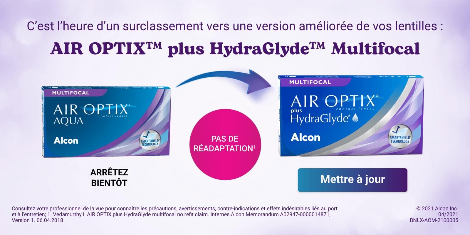 Les utilisateurs des lentilles Air Optix Aqua Multifocal peuvent commencer à utiliser les nouvelles lentilles Air Optix Plus Hydraglyde Multifocal sans nouvelle prescription.